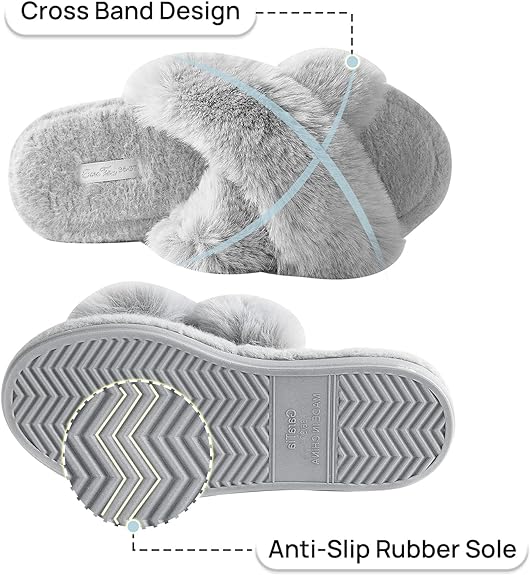 Women's Cross Band Plush Fuzzy House Slipper, Open Toe Faux Fur Fluffy Flats Bedroom Slippers, Size 10